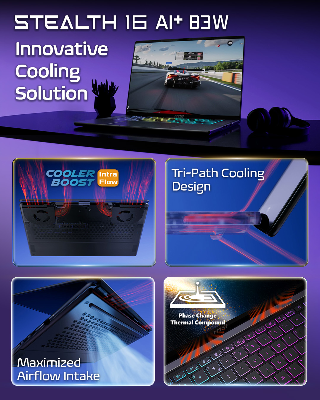 What’s keeping your Stealth 16 AI+ B3W chill and smooth in every game, under various workloads is the innovative cooling solution designed for performance and quietness.